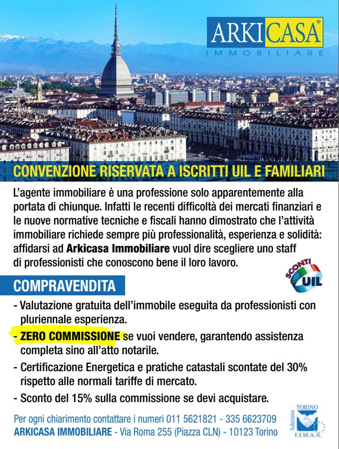 La nostra convenzionata Arkicasa Immobiliare (via Roma 255 a Torino) ha deciso di prorogare la sua interessante promozione: tutti gli iscritti UIL (o loro familiari) che entro e non oltre il 28 febbraio 2022 le affideranno la vendita del proprio immobile, avranno diritto gratuitamente al certificato energetico redatto da un professionista abilitato. (anzichè lo sconto del 30% originariamente previsto).