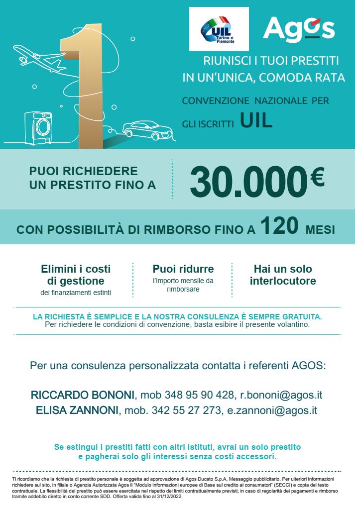 La convenzione nazionale con AGOS permette a tutti gli iscritti UIL di richiedere un prestito personale a condizioni agevolate anche per operazioni di CONSOLIDAMENTO DEBITI.