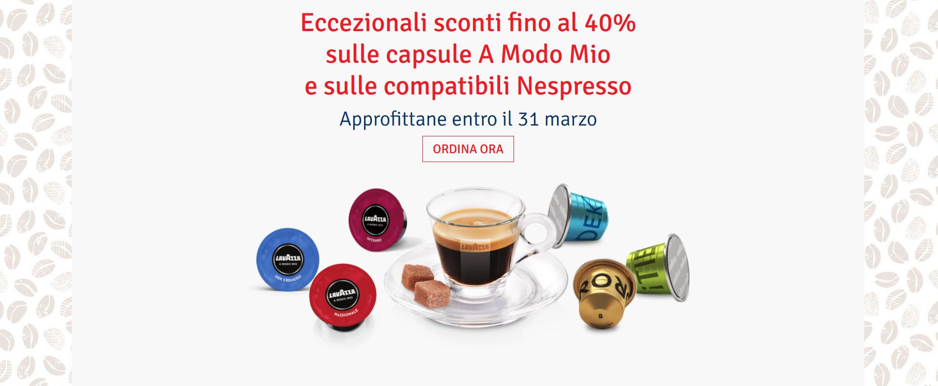 Se hai una macchina espresso Lavazza "A Modo mio" o una sistema "Nespresso" puoi approfittare di una ottima offerta sulle capsule di caffè LAVAZZA: sino al 15/4 puoi ordinarle tramite il link qui sotto con sconti SINO AL 43%!