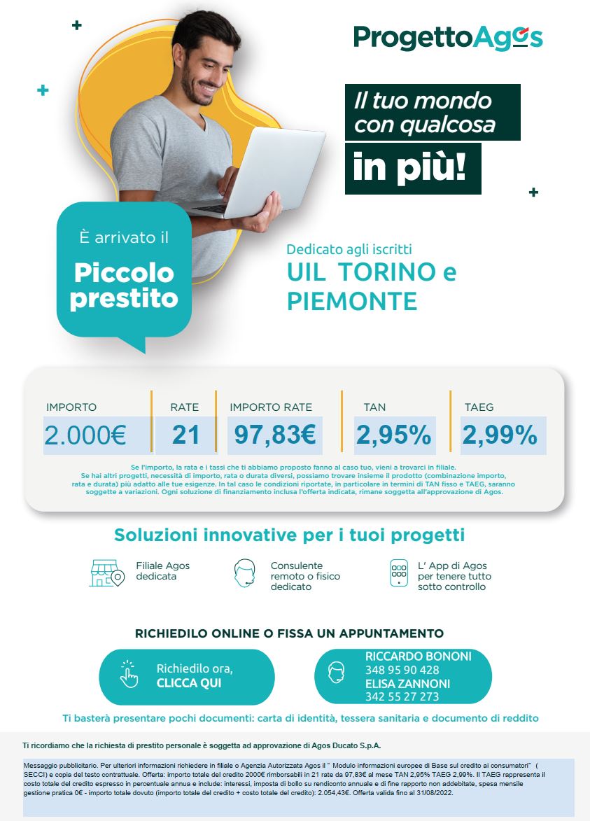 AGOS ha lanciato una promozione "estiva", valida sino al 31 Agosto, e riservata agli iscritti UIL Torino e Piemonte: è possibile richiedere il "Piccolo Prestito AGOS " da € 500 sino a € 2.000 con un TAEG del 2,99%.
