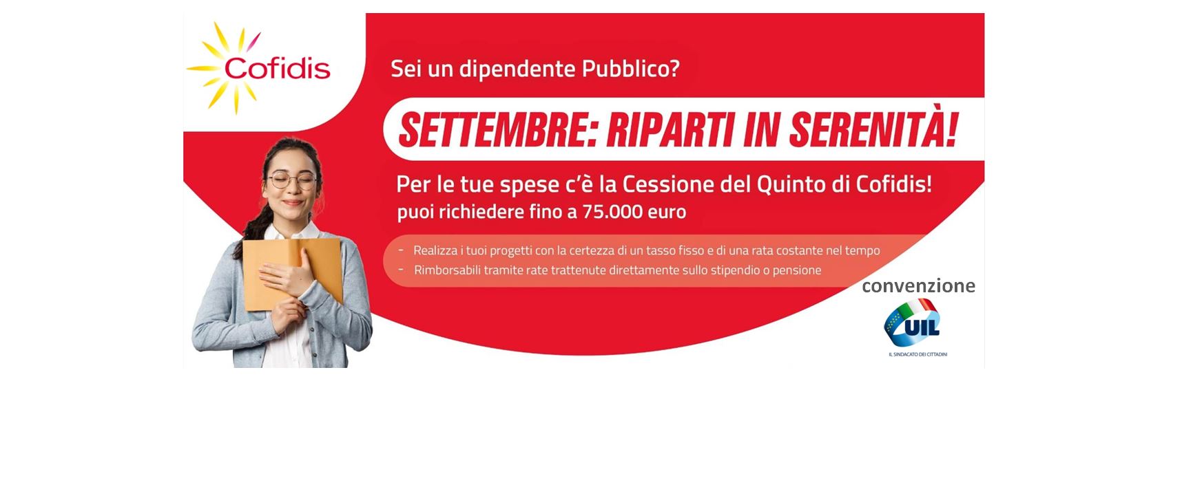 Se questo autunno hai bisogno di un finanziamento e sei dipendente pubblico (o ex dipendente, quindi pensionato), ti ricordiamo che puoi usufruire della convenzione UIL 2022 con COFIDIS (tramite la sua Agenzia italiana Sistema Retail Srl), che è specializzata nella CESSIONE DEL QUINTO dello stipendio. (e anche della pensione)